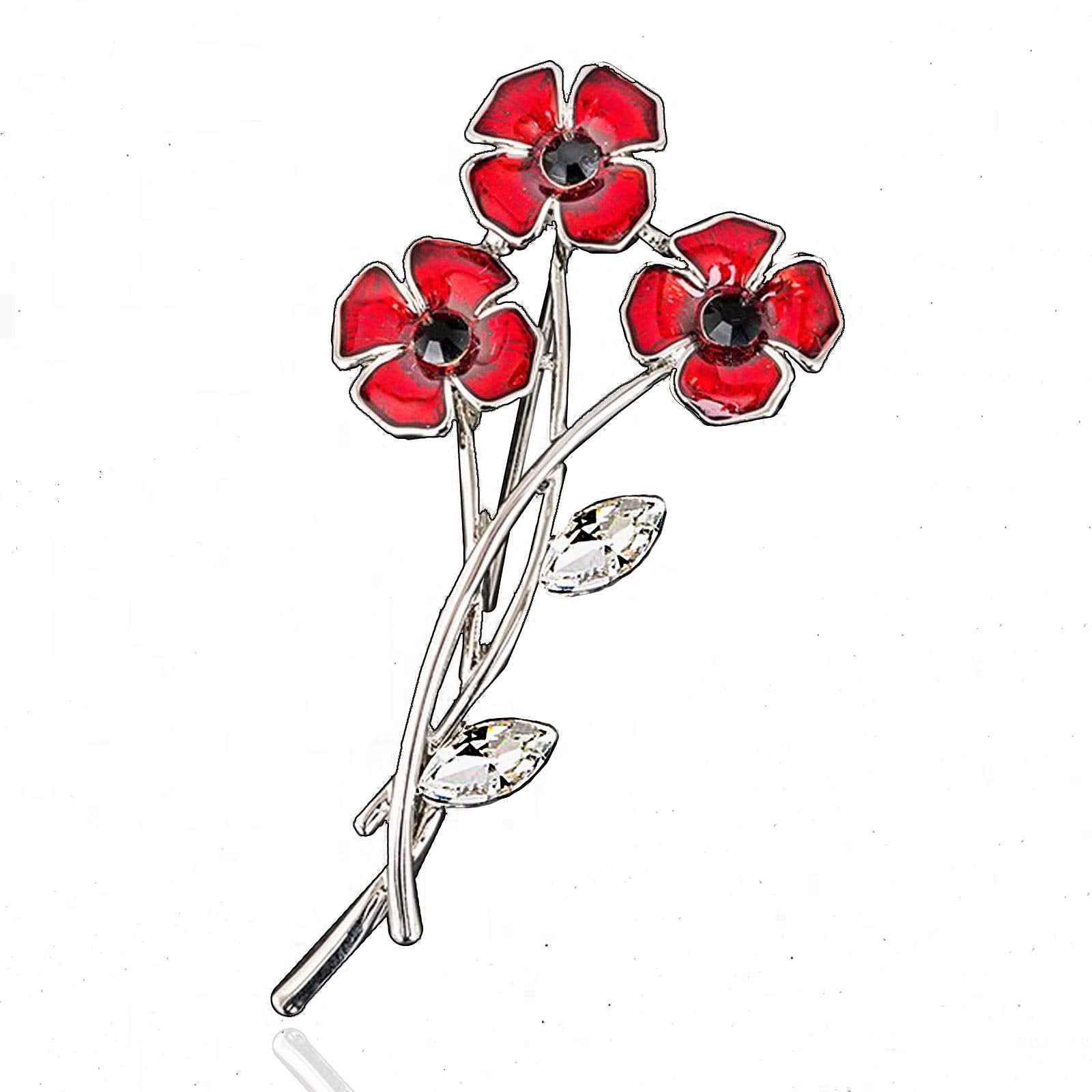 Featuring three beautifully enamelled red poppies with dark centres, complemented by sparkling crystal leaves on a silver-tone stem — it’s a timeless accessory that speaks of honour, pride, and gratitude.