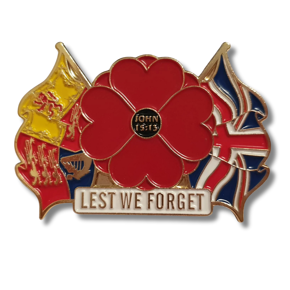 Wear your remembrance with pride. This beautifully detailed 45mm x 25mm soft enamel For King & Country Pin Badge features the Royal Standard and Union Flags united behind a red poppy—the enduring symbol of sacrifice. At the heart of the flower, “John 15:13” reminds us of the ultimate price paid. Finished with the words “Lest We Forget”, this badge is more than a tribute—it’s a statement of respect, remembrance, and unity.