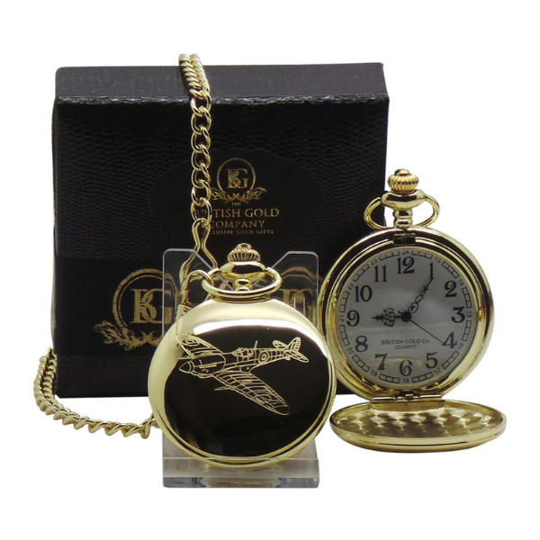 Embark on a journey through aviation history with the Supermarine Spitfire 24k Gold Clad Pocket Watch – a luxurious timepiece in pure gold plating with a reliable quartz movement, showcasing a highly detailed engraving of the iconic Spitfire on the front case, and a personalised touch on the back, allowing you to carry the symbolic significance of this legendary aircraft and a heartfelt message with you, making it not just a watch but a statement of timeless style and historical reverence.
